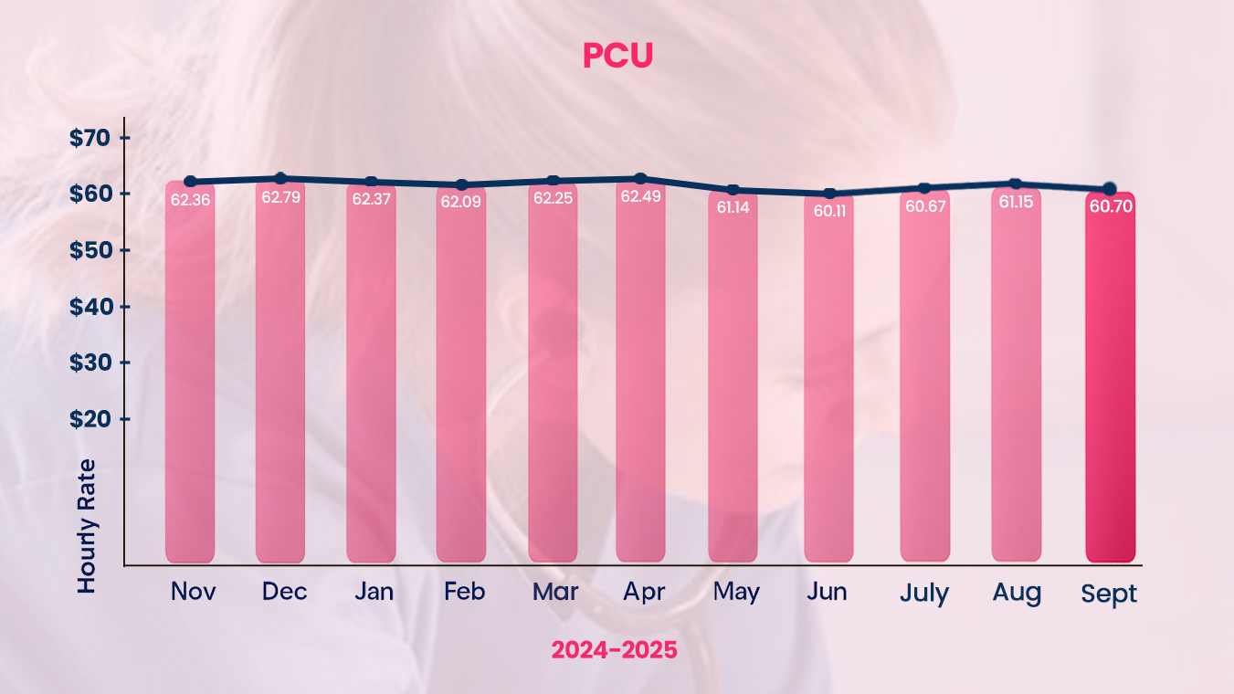 Trend: PCU RN salaries have been on a mild upward rebound since July. September data shows a slight decline in the trend.